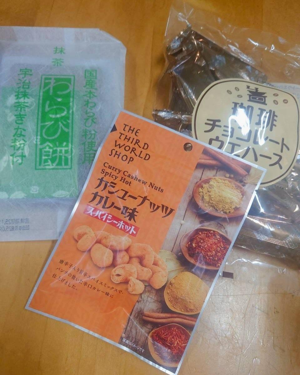 おやつタイムには、消費材のカシューナッツカレー味スパイシーホット、