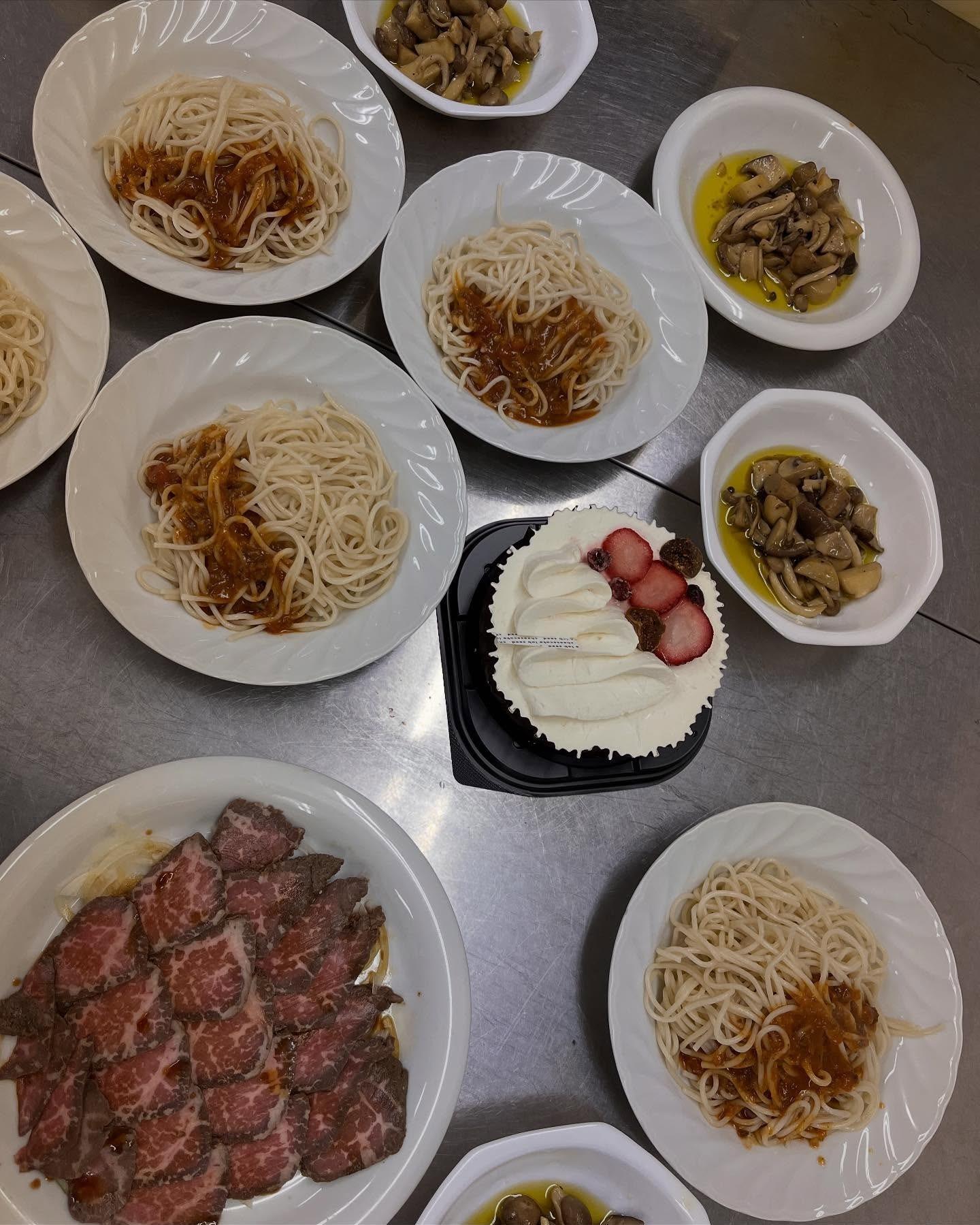 ミートソーススパゲッティそして苺のホワイトクリスマスチーズケーキ♡