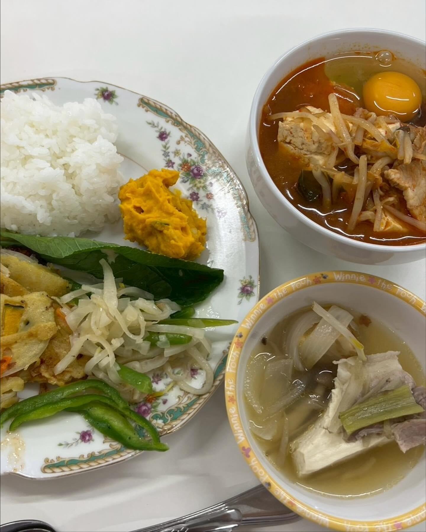 豆腐チゲとチヂミ、カボチャのサラダに小松菜スティック