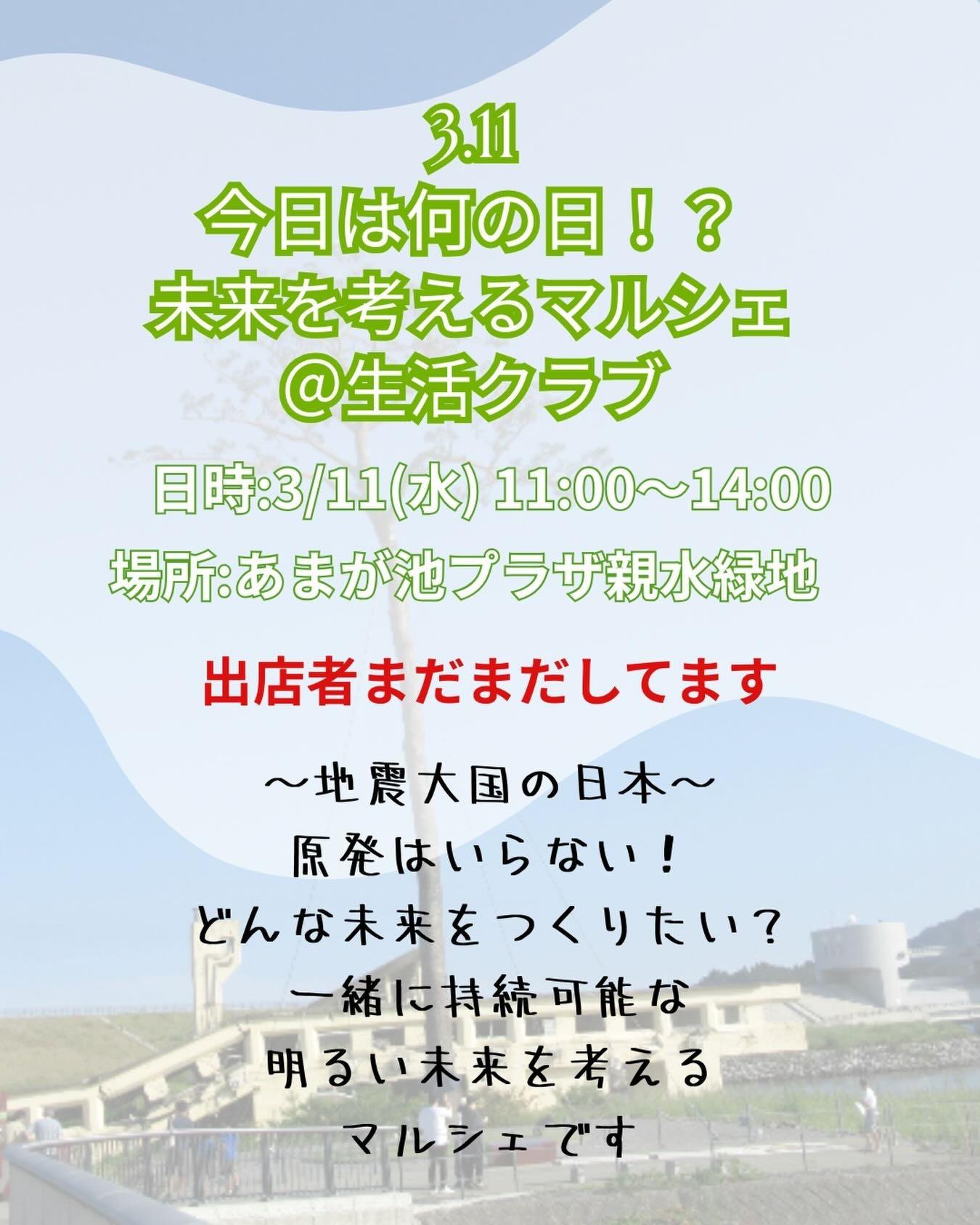 2026年3月11日(水) 守山 あまが池プラザ前にて3.11未来を考えるマルシェ 開催します✨✨ Tweet 2026年3月11日(水) 守山 あまが池プラザ前にて3.11未来を考えるマルシェ 開催します 出店者さんも随時募集してます #生活クラブ #滋賀イベント #マルシェ